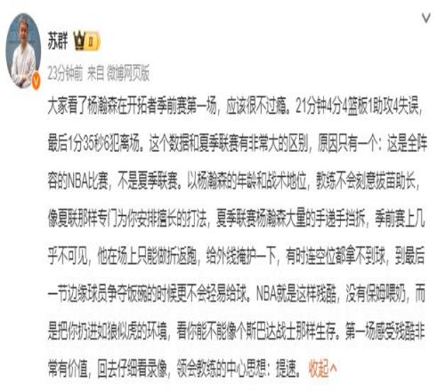 杨瀚森季前赛首秀引热议,国内评论员苏群写道:大家看了杨瀚森在开拓者季前赛第一场,应该很不过瘾。21分钟4分4篮板1助攻4失误,最后1分35秒6犯离场。这个数据和夏季联赛有非常大的区别,原因只有一个:这是全阵容的NBA比赛,不是夏季联赛。以杨瀚森的年龄和战术地位,教练不会刻意拔苗助长,像夏联那样专门为你安排擅长的打法,夏季联赛杨瀚森大量的手递手挡拆,季前赛上几乎不可见,他在场上只能做折返跑,给外线掩护一下,有时连空位都拿不到球,到最后一节边缘球员争夺饭碗的时候更不会轻易给球。NBA就是这样残酷,没有保姆喂奶,而是把你扔进如狼似虎的环境,看你能不能像个斯巴达战士那样生存。第一场感受残酷非常有价值,回去仔细看录像,领会教练的中心思想:提速。