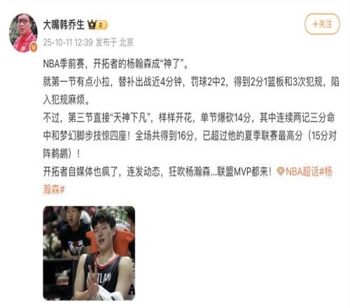 雷速体育10月11日讯 今天上午,杨瀚森在开拓者124-123击败国王的NBA季前赛中发挥出色,贡献16分、4个篮板和3次盖帽。著名媒体人韩乔生发文,称赞了杨瀚森的表现。