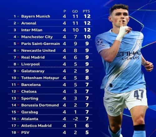 而最让人惊喜的莫过于纽卡斯尔,在与毕巴的“英西大战”中,他们2-0取胜,开局3胜1负拿到9分,仅输给过巴萨。4轮后,纽卡的积分与大巴黎和皇马一样,并且凭借净胜球优势排名第6,甚至力压皇马。