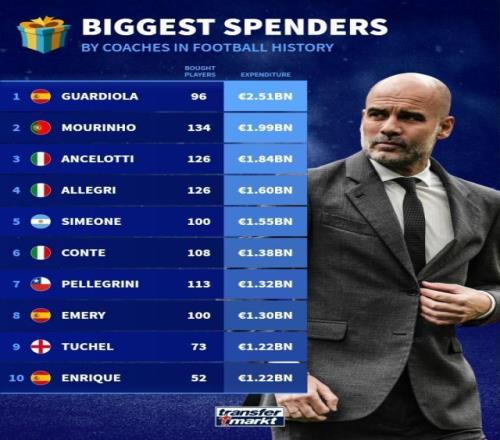 足坛历史主帅引援花费排行:瓜帅25.1亿欧领跑,穆帅19.9亿欧第二